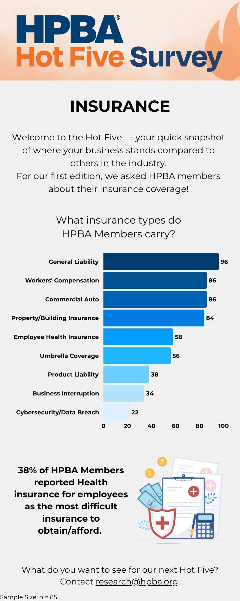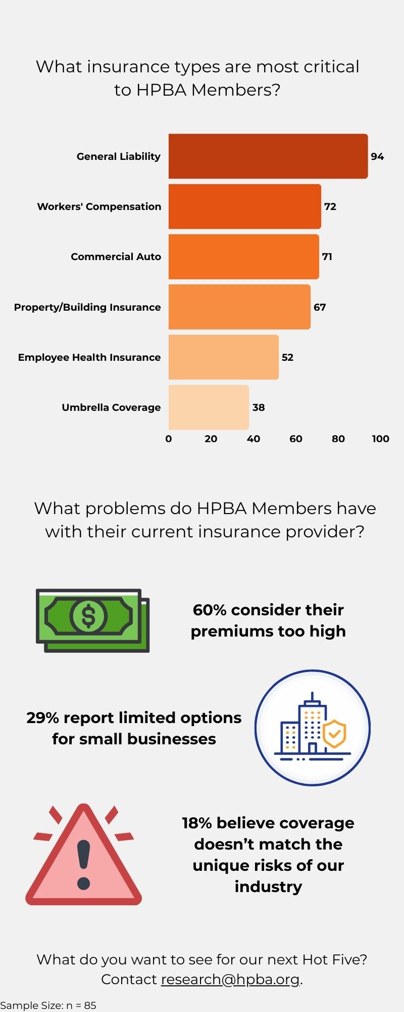 HPBA's first-ever Hot Five Infographic is here! It offers a quick look at what insurance policies your peers are carrying, what they find most challenging to obtain, and where they feel their current providers are falling short. See below for how you compare to the industry!